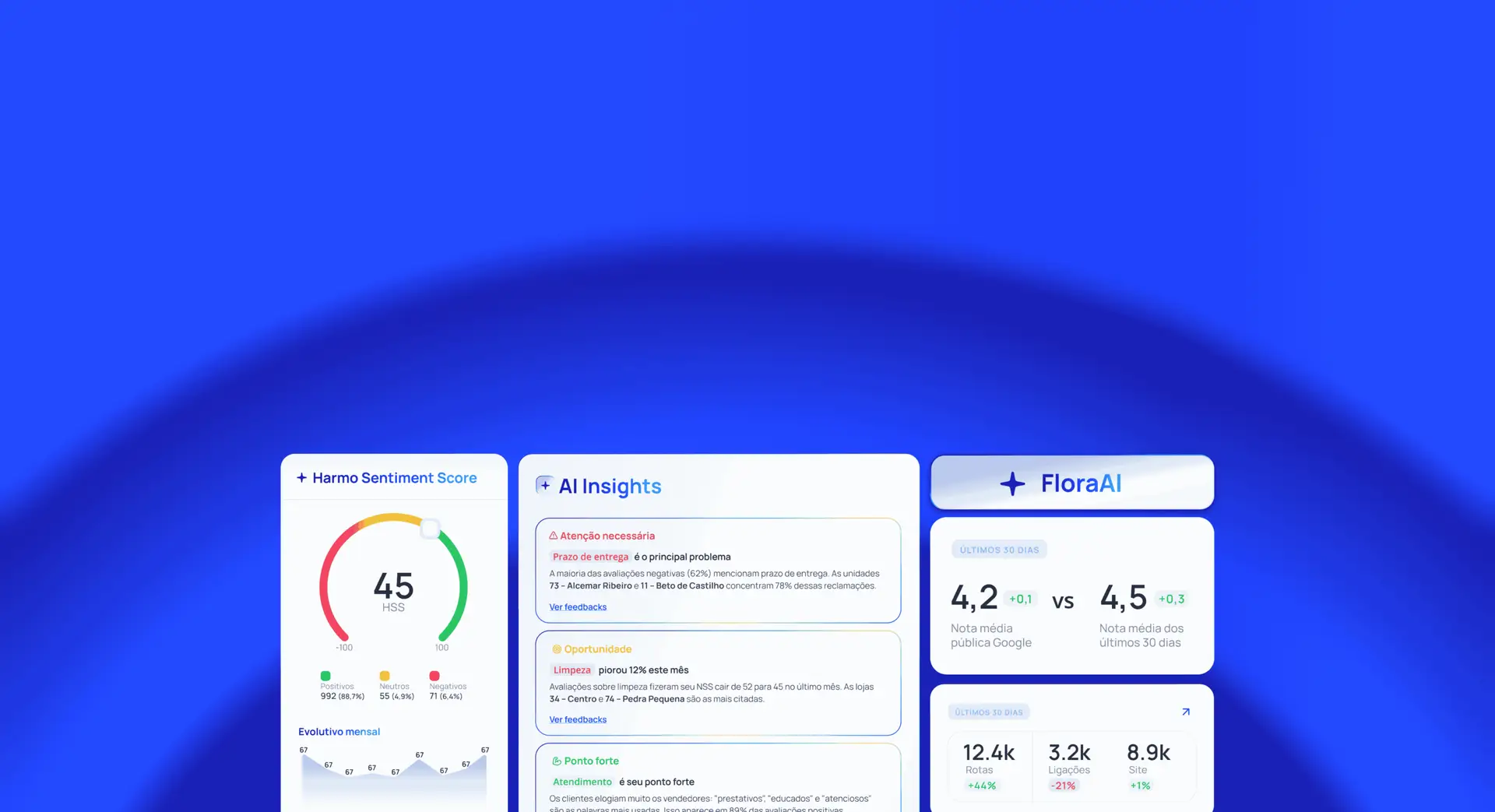 A Harmo é a única plataforma que integra presença digital, reputação e pesquisas em um único sistema, transformando a voz do cliente em mais fluxo para suas lojas, do online para o offline.